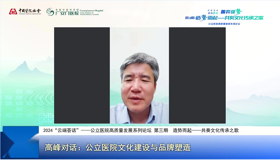 6月20日,由中国医院协会中医医院分会和中国中医科学院广安门医院举办的第3期“善弈谋势 云端荟话”公立医院高质量发展会议线上举办。本次会议以“造势而起 共奏文化传承之歌”为题,邀请了融媒体领域专家与国内高水平公立中医医院、综合医院管理者,共同围绕公立医院如何通过文化建设和品牌塑造承担好传达卫生健康理念、引导正确舆论信息、提升医院整体形象、传承医药文化的使命任务,分享成功经验、拓宽发展路径,助力公立医院文化建设高质量发展。