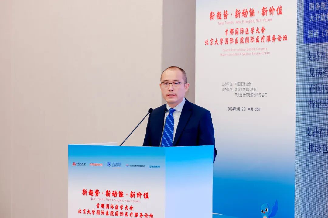9月12日,在由中国医院协会主办、北京大学国际医院和平安健康保险股份有限公司承办的“新趋势、新动能、新价值”,首都国际医学大会暨北京大学国际医院国际医疗服务论坛在京召开。中国医院协会副会长毛群安,国家卫生健康委国际交流与合作中心快车救援外联部副部长马冉,北京市卫生健康委二级巡视员郑晋普,上海泓悦医疗科技有限公司总经理戚贤斌,汇每极致医疗董事长、汇海国际医疗创办人屈伟,西安国际医学中心医院副院长张斌,和睦家医疗创始人、新风医疗副董事长李碧菁,中国医院协会国际医疗专委会副主委、原中日友好医院国际医疗部CEO张知新,平安健康险政府业务部负责人黄芹芹,北京大学国际医院党委书记、院长梁军及医院党政领导班子,北京各医院国际部主任、平安集团及各成员公司在京机构、北大医疗集团及各成员公司在京机构领导出席会议。会议由中国医院协会国际医疗服务专委会常务副秘书长赵亮主持。
