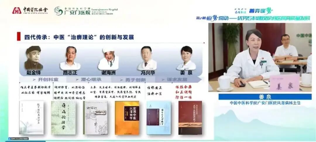 中山大学附属第一医院党委副书记、纪委书记何韵主题报告姜泉主任介绍了中国中医科学院广安门医院风湿病科的四代传承历史。科室通过强化人才梯队建设,坚持中医药原创思维,聚焦学科中医优势病种,开展创新性研究,建立国内首个中医药治疗RA万人随访队列,拓展中医药学术空间,构建“防、治、保、康、养”新模式。同时,按照医院规划为助力区域医疗中心协同发展贡献力量。