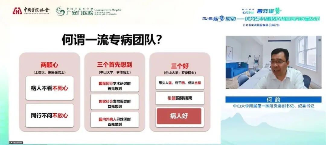 国家中医药管理局中西医结合与少数民族医药司邴媛媛司长主题报告何韵书记介绍了什么是专病团队,分享了中山大学附属第一医院五大病种呈现出的团队好、成果好、病人好的成功经验。提出倡导围绕“临床问题”开展高质量临床研究,坚持问题、目标、结果三个导向统一,聚力打造高效优质人才供应链,体制机制机制创新,打造一流专病团队。